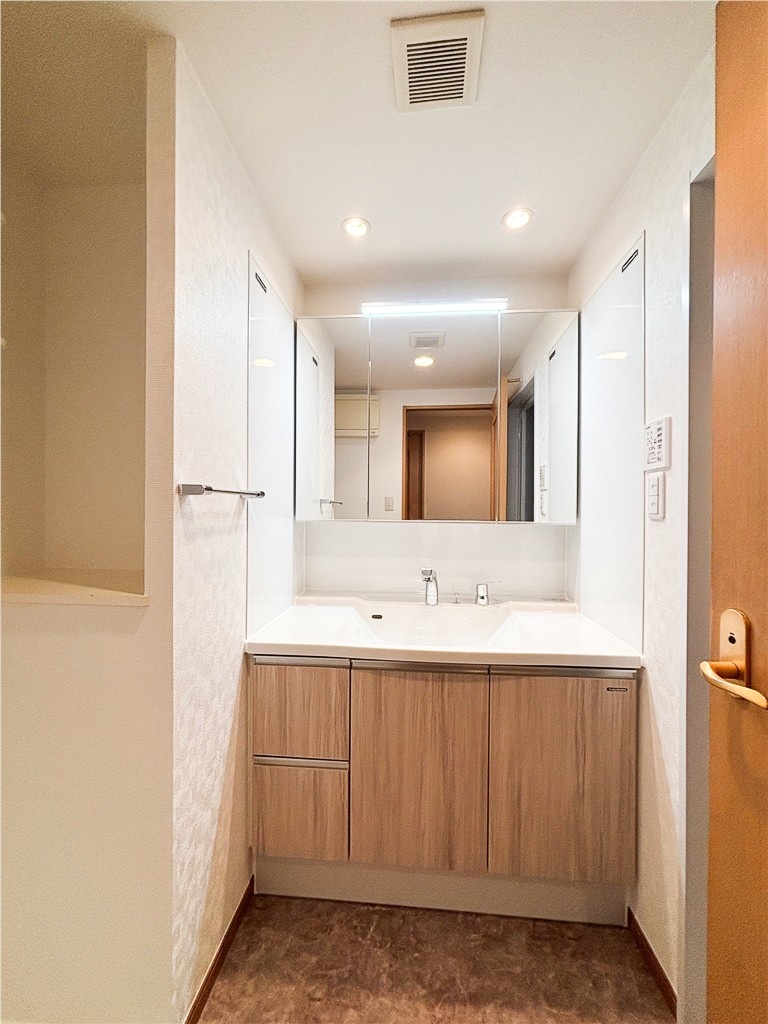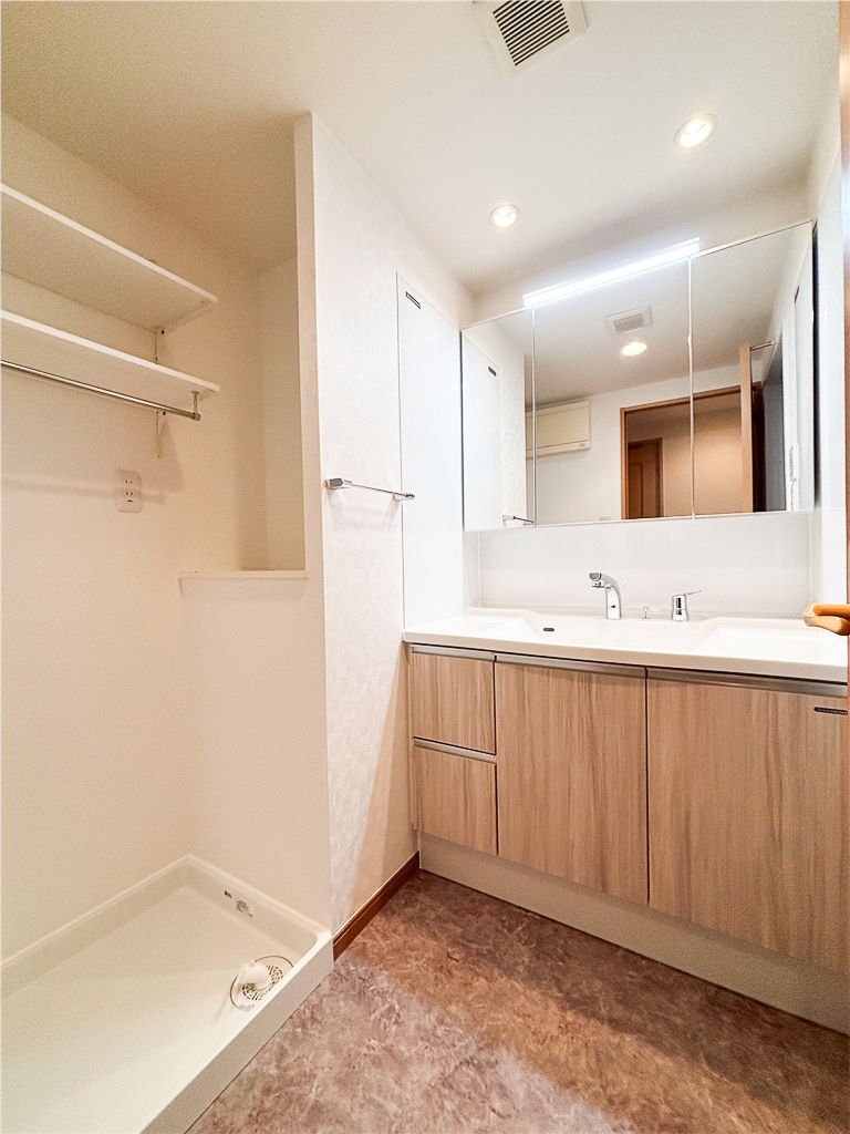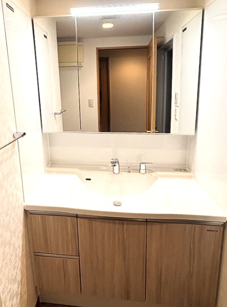 ミラーの上部にも照明があり、窓がなくても非常に明るくすっきりとした印象になったと思います。